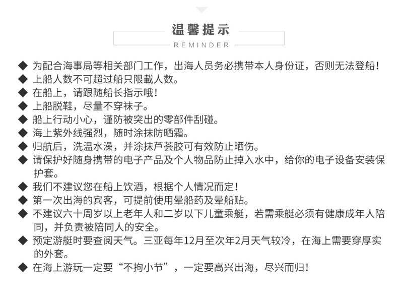 選配項目: 摩托艇、飛魚、香蕉船、水上飛行器、飛拖、滑板
